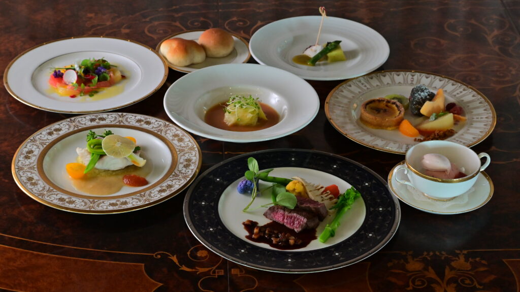 アミューズ、オードブル、スープ、魚料理、お口直し、肉料理、デザートの全7品。