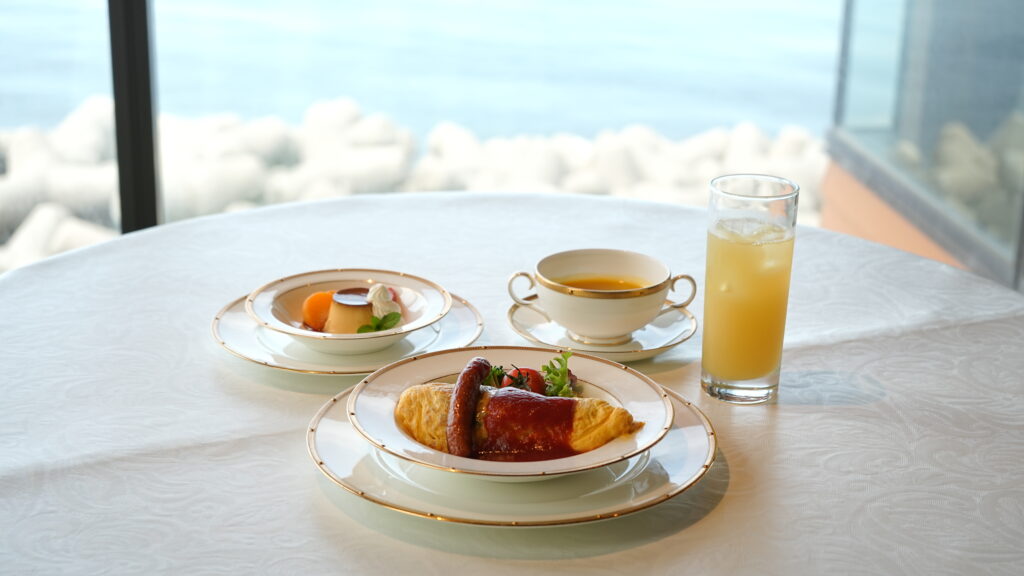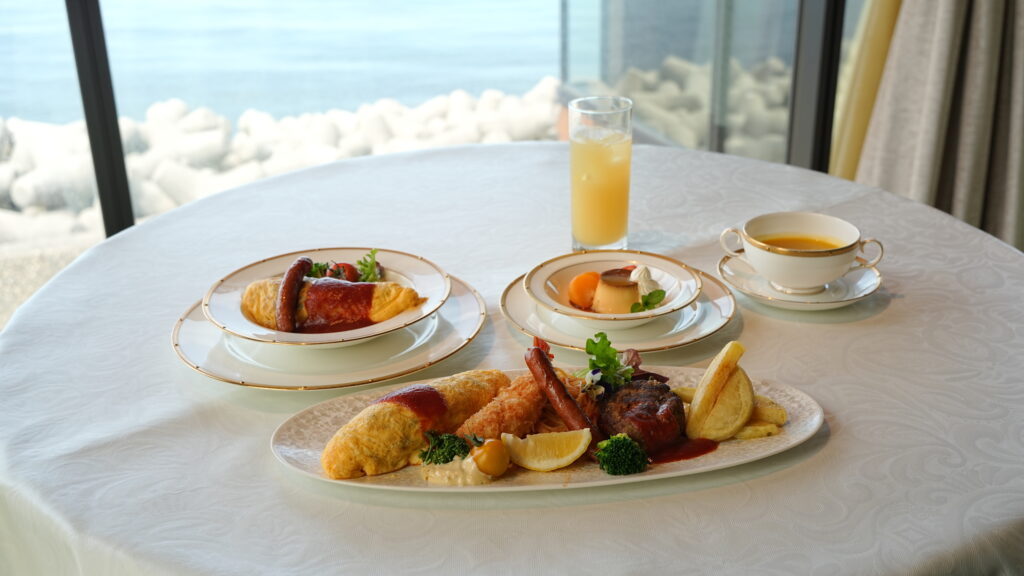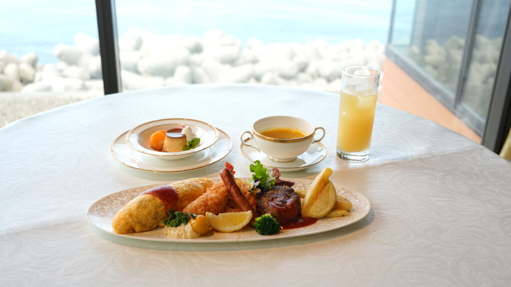 スープに加え、ケチャップオムライス、ナポリタンスパゲッティ、ハンバーグ、エビフライ、ポテトフライなど、多彩なお料理を一皿に盛り込んだ、華やかで満足感のあるプレートでございます。