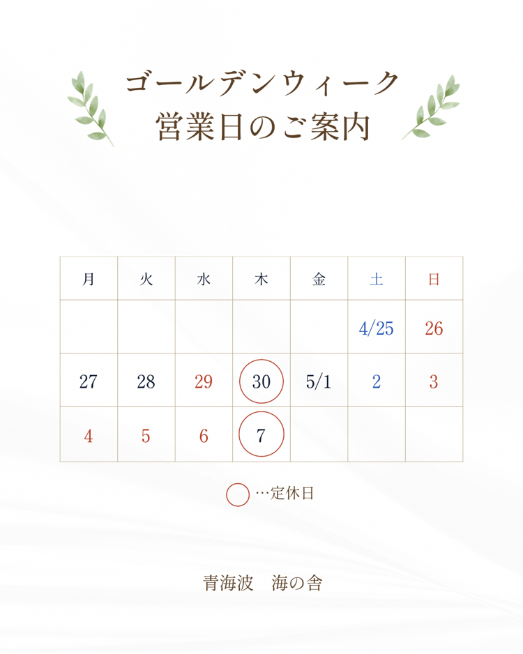 海の舎は、4月30日(木)と5月7日(木)の定休日を除き、通常通り営業いたします。